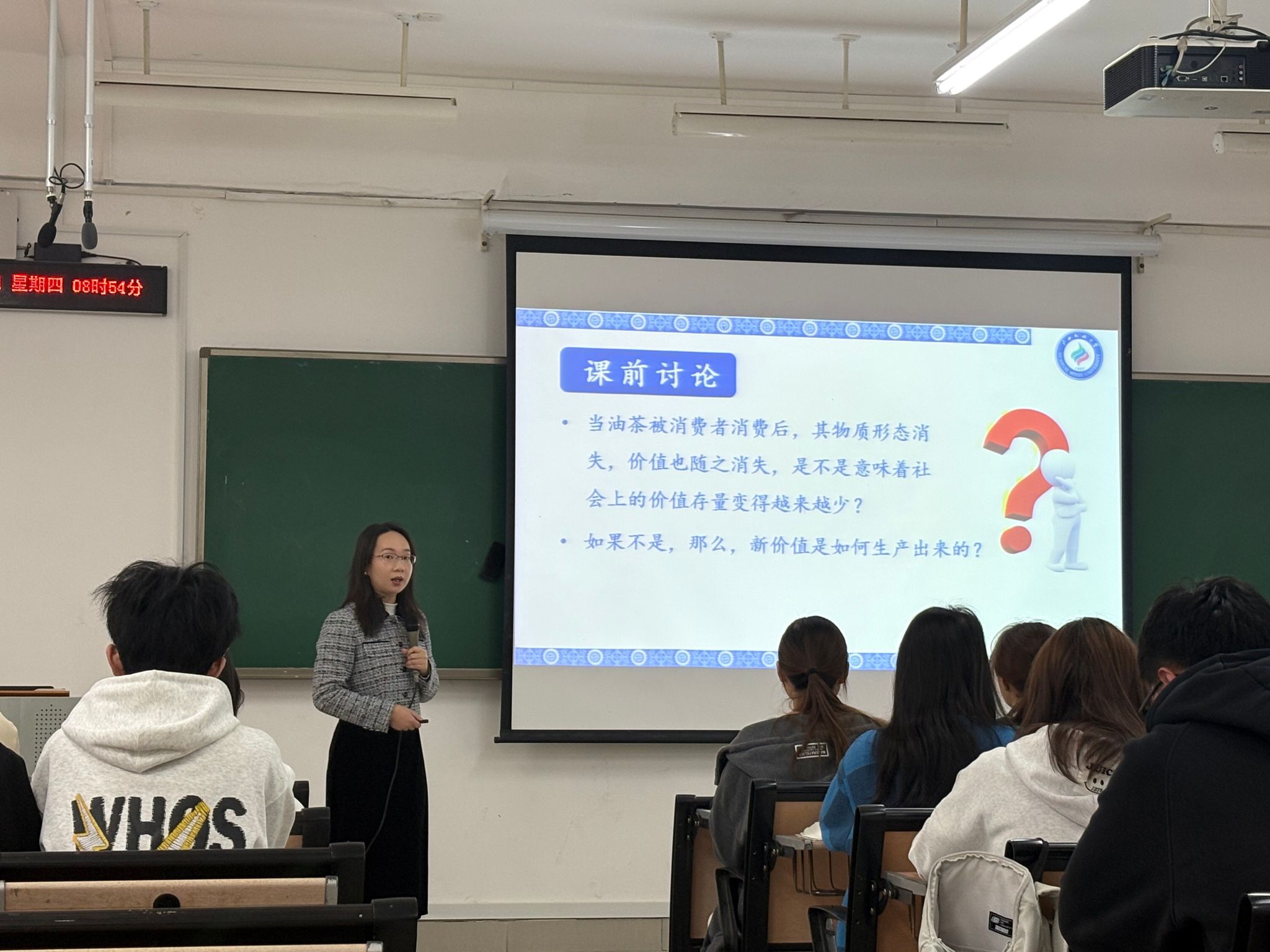 课堂上,方冬莉老师以学生预习内容为切入点,巧妙融入广西恭城油茶等具有民族特色的案例,并结合天平动画图示,将抽象的价值增值理论生动具象化,使复杂原理清晰易懂。她注重课堂互动,引导学生积极思考,营造了活跃而有序的教学氛围。